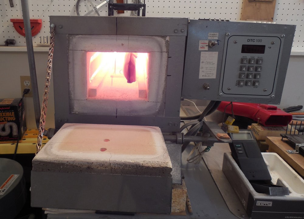 Finished my heat treating. Here’s a few photos – blades were placed in a custom built cage and wrapped in a nickle/titanium pouch. This step was taken to ensure the blades were protected from oxidization in the ovens that runs up to 1975 degrees F for ATS-34 stainless steel. The laboratory process controller ensured the ovens maintained the perfect temperatures during firing. After being removed from the oven and unwrapped, the blades were quickly cooled and tested to ensure a Rockwell hardness of 60-61. Now I can remove the oxide residue and start the glue up of the handles for W18, W19 and W20 this week.