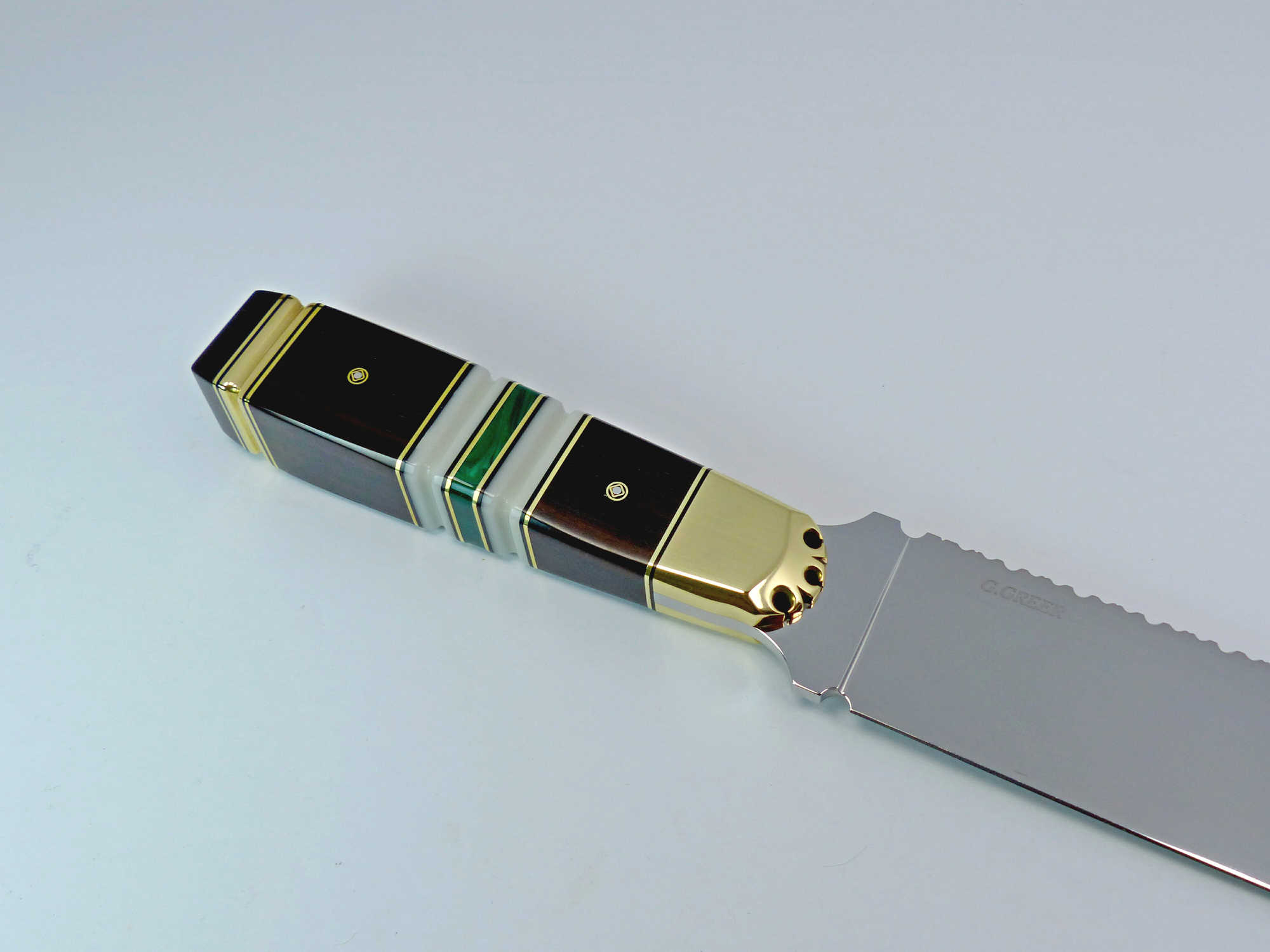 This bowie style knife has been completely redesigned to create an amazing piece of art made up of 40 pieces. Embellished with malachite and Corian bands separated by black and brass liners, inlaid malachite on the handle butt surrounded by a square brass bezel – this knife is truly an amazing piece of work.
