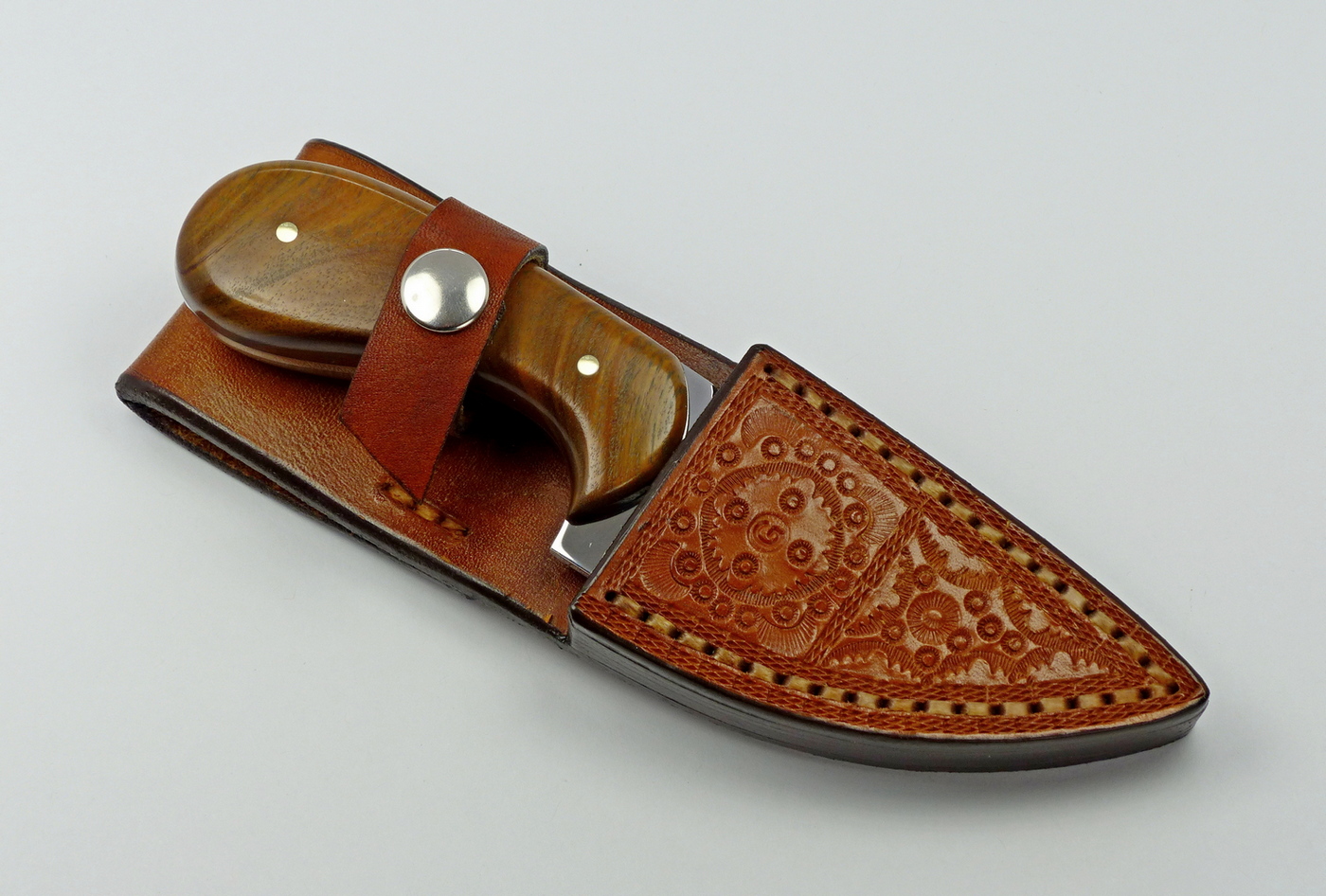 The leather sheath that comes with this hunting knife has been handmade by the knifemaker. Each unique sheath has been hand tooled and dyed, welted and custom fitted to each knife for a secure fit.